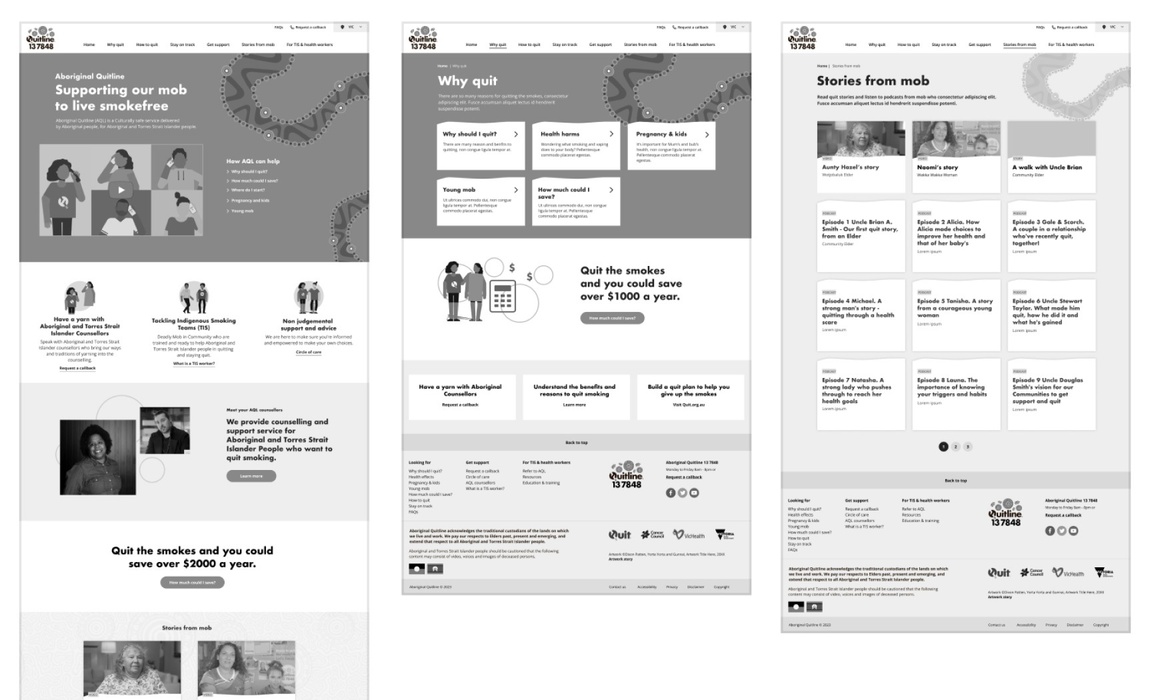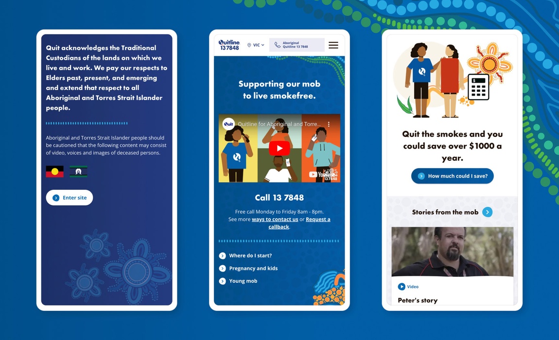 An important part of the process for the user experience and design of this website was to work with Aboriginal and Torres Strait Islander communities at every stage. The design needed to feel distinctly Aboriginal, but was still required to visually communicate the recognisable Quit brand.