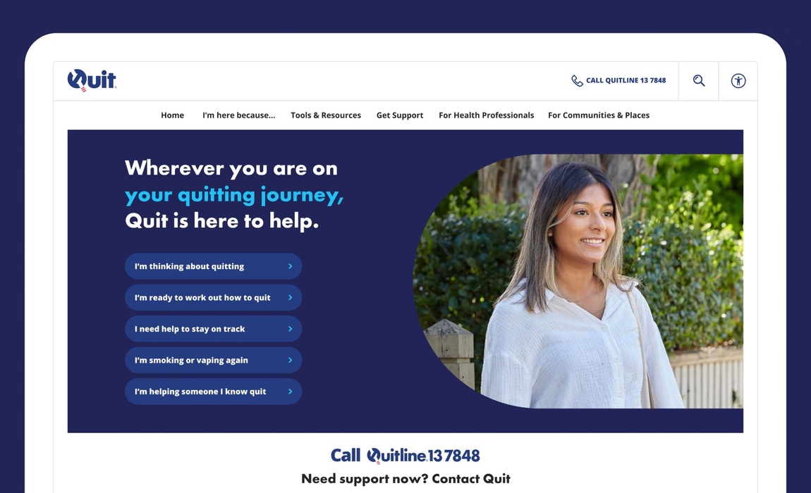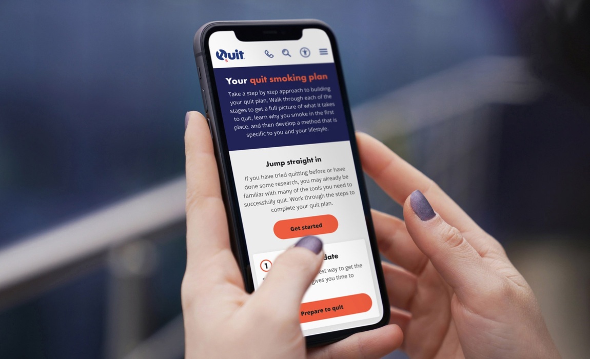 We redesigned the Quit website to provide a more youthful brand and user experience. This ensured that support was easy to access, especially across devices. The website focuses on supporting younger audiences and empowering health professionals and community groups to assist their patients and communities in quitting smoking and vaping. Craft CMS provides the content team a flexible solution for content management.