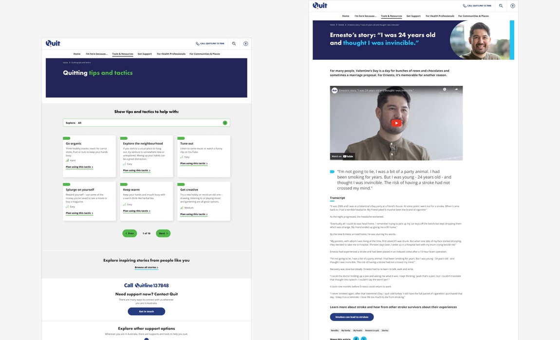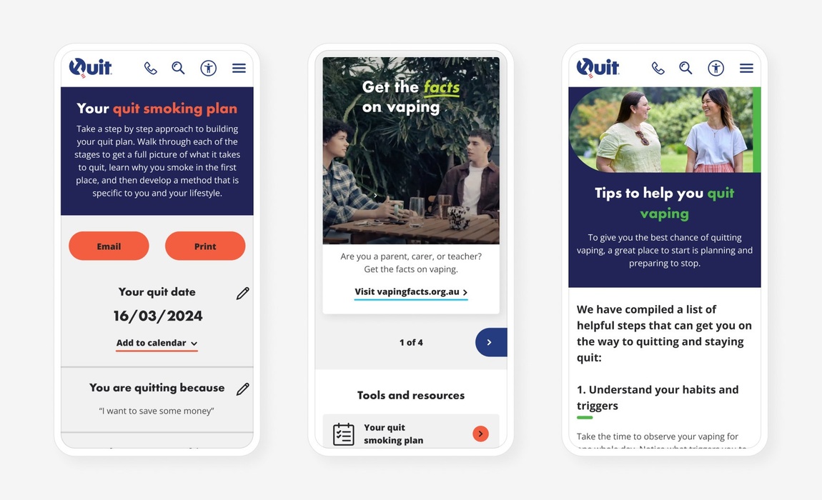 In response to the rise of vaping nicotine addiction among young Australians, we helped Quit relaunch their website, providing a more inclusive and youthful experience including tools, health resources, and expanded support for quitting smoking and vaping.