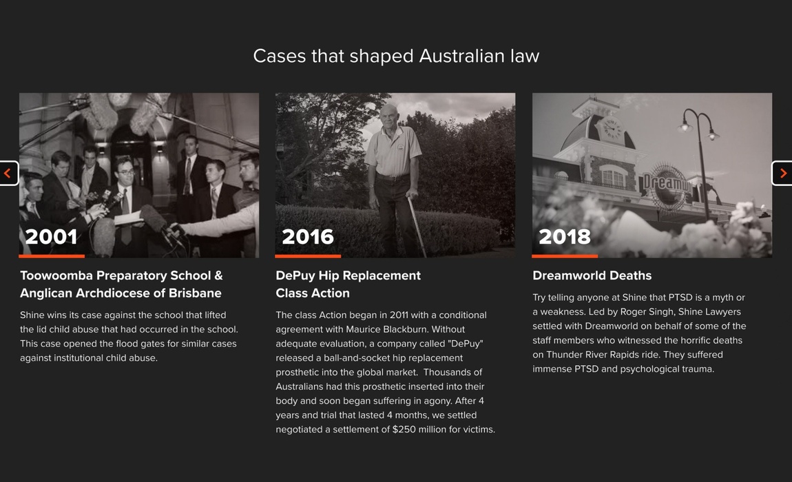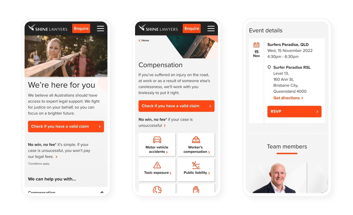 Shine Lawyers is a leading Australian law firm specialising in damages-based plaintiff litigation. The website conveys intricate legal information to both present and potential clients while offering guided pathways to connect with a lawyer.