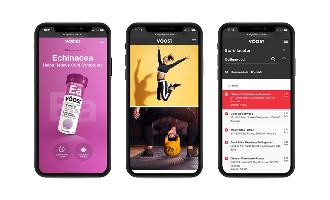 Bold and bright, the website brings together VOOST's global range whilst letting each product shine. Customers can easily find their local stockists in Australian and the UK.
